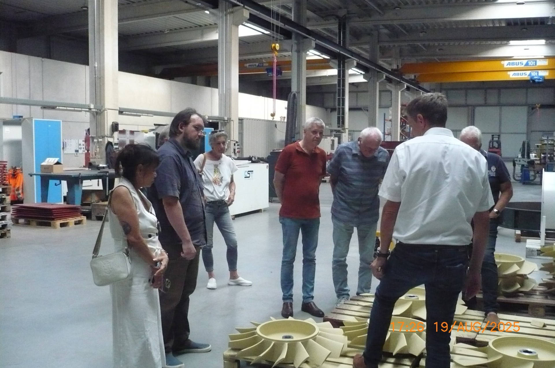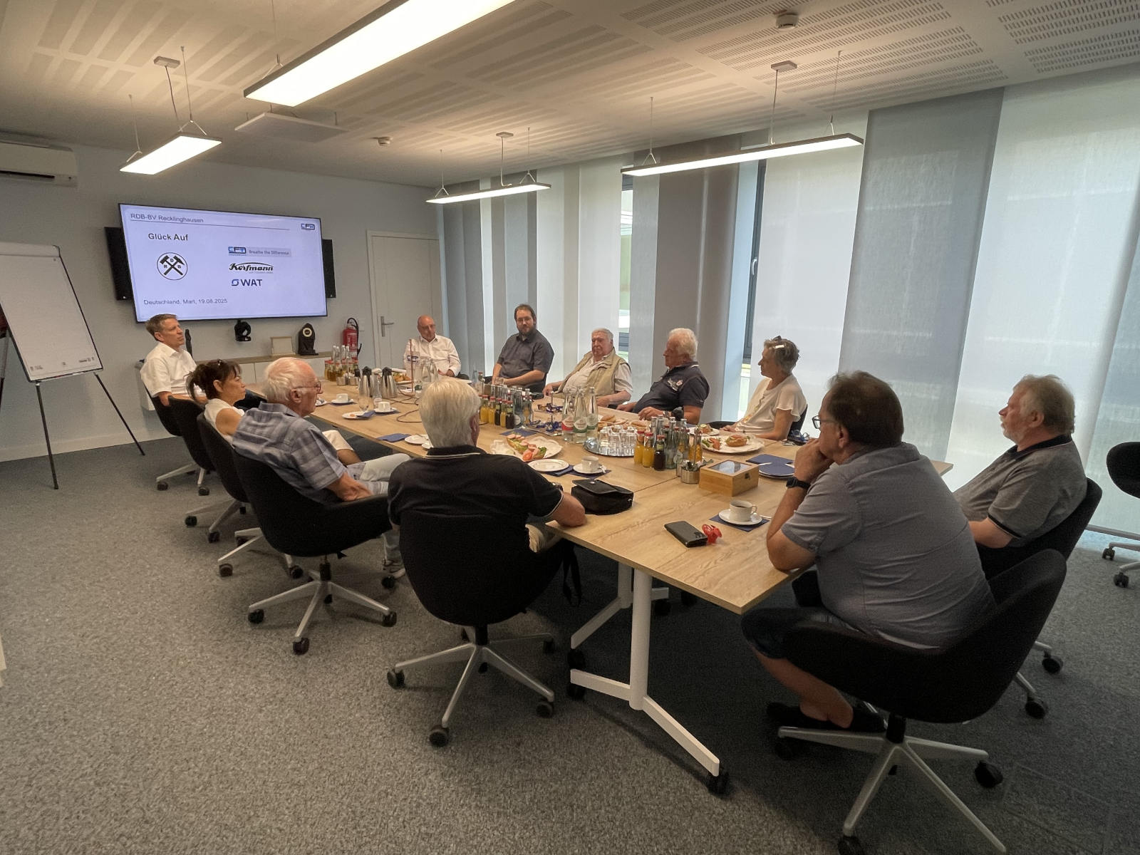 Am 19.08.2025 besuchten wir vom RDB BV Recklinghausen mit einer Gruppe von 10 Teilnehmern die Firma CFT Compact Filter Technic in Marl, die dort im Rahmen der übergeordneten CFH Holding ihren Firmensitz hat. Der Besuch war lange durch Herrn Thomeczek, Prokurist und Vice-Präsident der Firma CFT, mit uns abgesprochen. Auf dem neuen Werksgelände begrüßte uns dann Herr Thomeczek recht herzlich. Der Tisch war mit Brötchen und Kuchen gedeckt und die Klimaanlage sorgte an diesem warmen Tag für ein sehr gutes Klima. Direkt dazu kam dann auch Herr Kegenhoff, der als Mitglied der Geschäftsführung der Firma Korfmann und Prokurist, Vice-Präsident der Firma CFT den Part der Lüftertechnik übernahm. Die Firma CFT hatte vor über 25 Jahren die Idee, saubere Luft am Arbeitsplatz unter Tage, meist im Streckenvortrieb, zu ermöglichen. So entstanden die Filterstationen, die CFT heute noch etwas modifiziert in alle Welt verkauft. Die Firma Korfmann, ebenfalls Teil der CFH Holding, ist ein traditioneller Lüfterhersteller für den Untertagebetrieb. Jeder Ortsvortrieb bzw. jede zu bewetternde Stelle untertage war mit diesen Lüftern ausgestattet. Somit ist Korfmann auch für uns ein vertrauter Name. Um das ganze etwas aufzulockern, gab es eine kleine Vorstellungsrunde. Nachdem sich unsere Gastgeber kurz vorstellten, gab es auch eine Vorstellung unsererseits. So war das Eis schnell gebrochen und jeder hatte seine eigene Bergbaugeschichte. Bergleute verstehen sich eben sofort. |