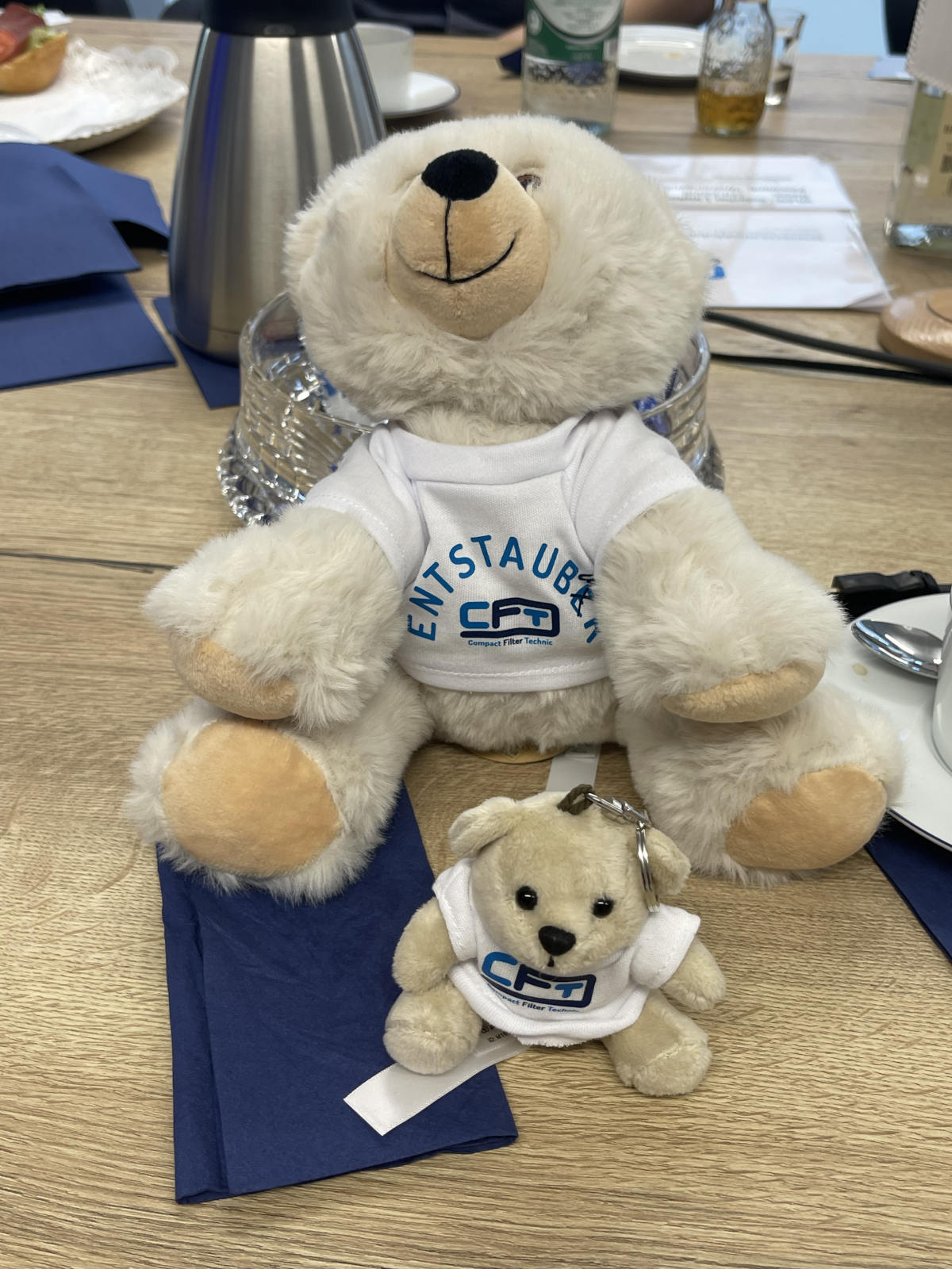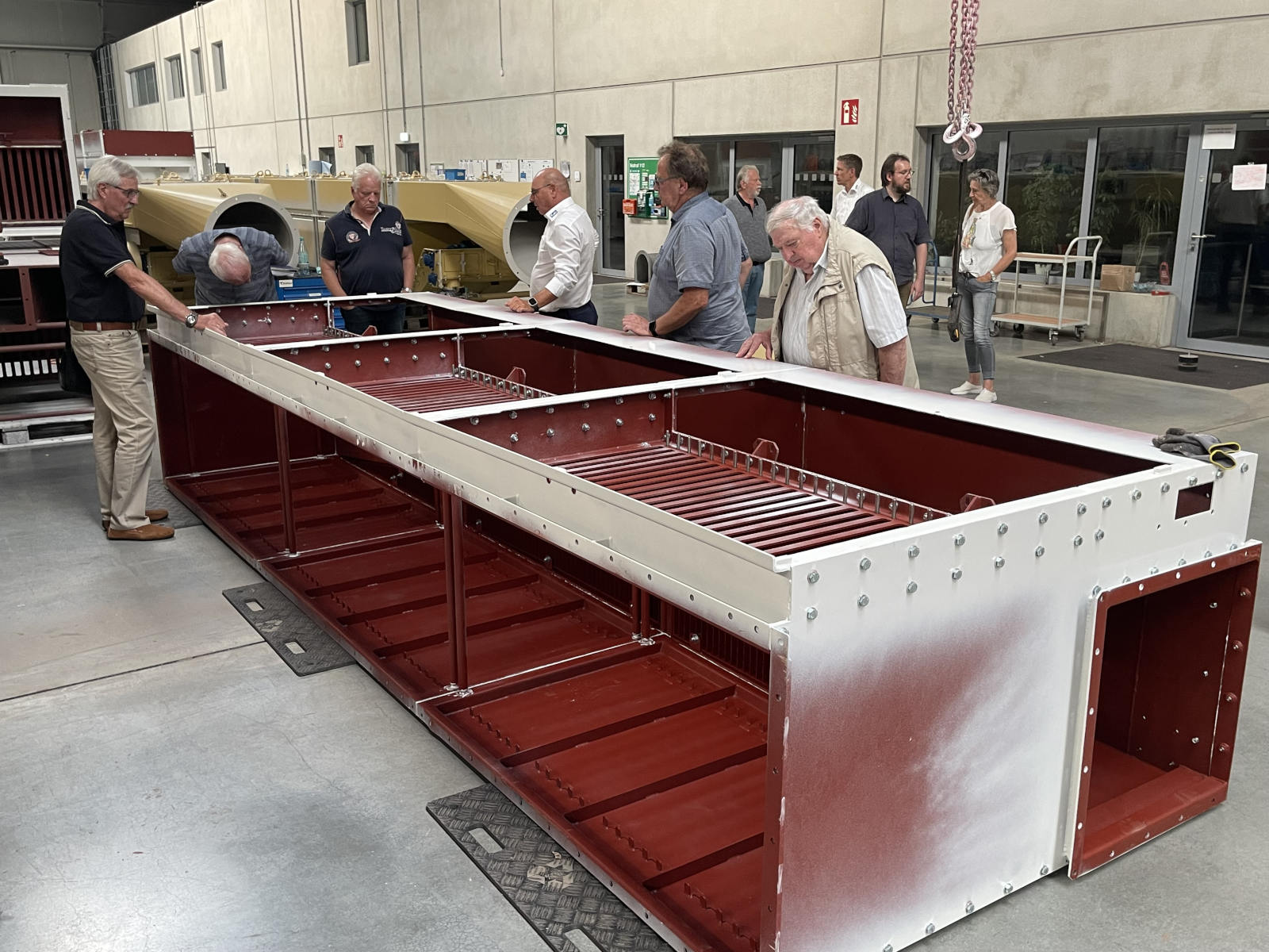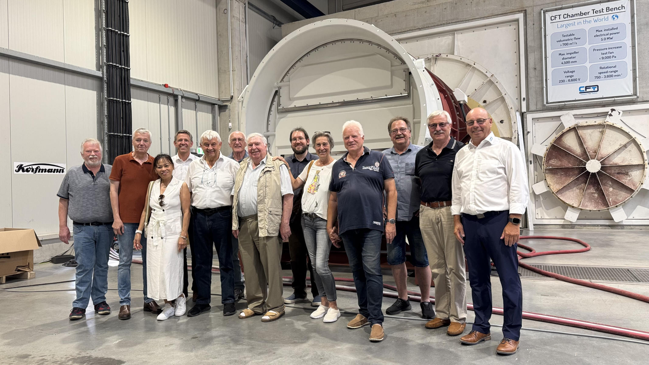 Werksbesichtigung auf. Nach zwei Gruppenfotos ging es dann in die riesigen nagelneuen Werkshallen. Wir sahen große und kleine Lüfter, Entstaubungsanlagen aber das wirkliche Highlight ist ein gigantischer Prüfstand für Lüfter mit einem maximalen Durchmesser von 4,5 m. Er besteht aus einem riesigen Ansaugtrichter außerhalb des Gebäudes, einer Druckschleuse mit der die unterschiedlichsten Gegebenheiten simuliert werden können, einem Lüfterprüfstand mit bis zu 5 MW Leistung und einem massiven Abluftstromkanal. Es ist nicht umsonst der größte Lüfterprüfstand der Welt. Was man nicht alles so im Kreis Recklinghausen findet. Am Lüfterprüfstand trafen wir noch einmal Herrn Dr. Both, er ließ es sich natürlich nicht nehmen gerade vor diesem gigantischen Bauwerk ein gemeinsames Gruppenfoto mit uns aufzunehmen. Was man auch noch einmal lobend erwähnen muss, auch wenn es sich um ein relativ neues Gebäude handelt, egal ob im Bürotrakt oder in der Werkstatt. Alles ist sauber, es liegt korrekt an den Plätzen, so möchte man arbeiten. Man spürt sofort auch die Verbundenheit der Mitarbeiter zum Betrieb. Was der Chef vorlebt wird zum Standard, andere brauchen dafür Unternehmensberater. Zurück im Sitzungszimmer gab es nach einer kurzen Verschnaufpause dann wirklich einen Bergmannsschnaps. Unsere Gruppe ließ es sich natürlich nicht nehmen dazu auch das Steigerlied anzustimmen, aber auch unsere Einlader waren sehr textsicher und stimmten gut mit ein. Nach einigen offenen Fragen und abschließenden Worten bedankte sich dann unser Geschäftsführer Klaus Pirsig mit einem keinen Präsent bei unseren Gastgebern. Ganz unerwartet gab es dann noch aus der CFT-Familie große Bären für die Damen und kleine Bären für die Herren. Eine wirklich sehr informative Veranstaltung in