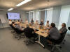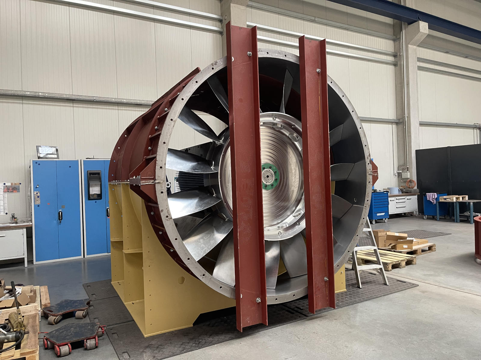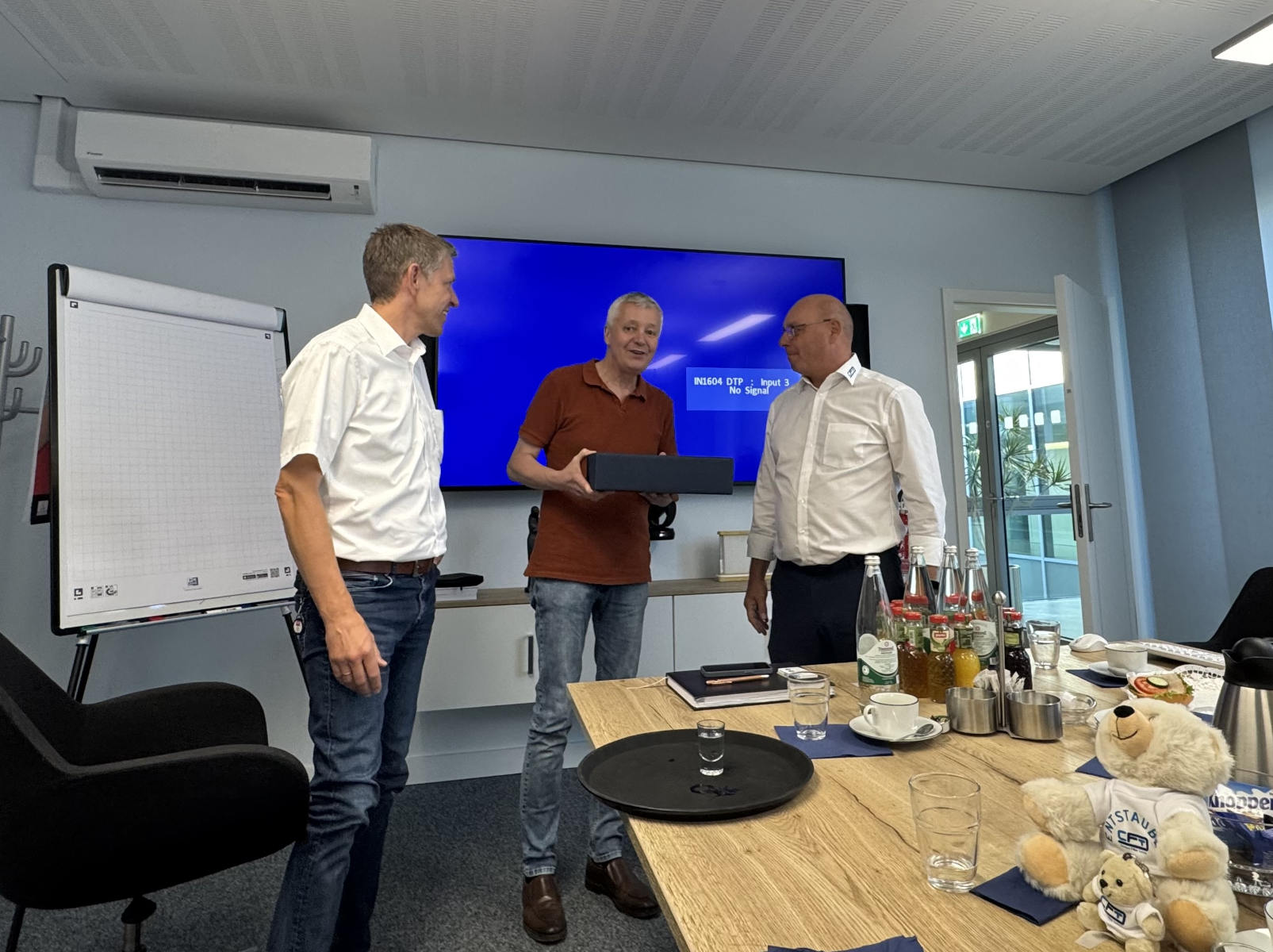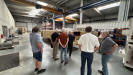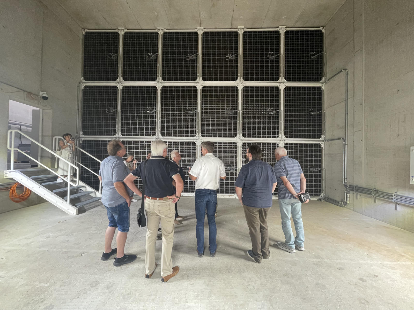 Werksbesichtigung auf. Nach zwei Gruppenfotos ging es dann in die riesigen nagelneuen Werkshallen. Wir sahen große und kleine Lüfter, Entstaubungsanlagen aber das wirkliche Highlight ist ein gigantischer Prüfstand für Lüfter mit einem maximalen Durchmesser von 4,5 m. Er besteht aus einem riesigen Ansaugtrichter außerhalb des Gebäudes, einer Druckschleuse mit der die unterschiedlichsten Gegebenheiten simuliert werden können, einem Lüfterprüfstand mit bis zu 5 MW Leistung und einem massiven Abluftstromkanal. Es ist nicht umsonst der größte Lüfterprüfstand der Welt. Was man nicht alles so im Kreis Recklinghausen findet. Am Lüfterprüfstand trafen wir noch einmal Herrn Dr. Both, er ließ es sich natürlich nicht nehmen gerade vor diesem gigantischen Bauwerk ein gemeinsames Gruppenfoto mit uns aufzunehmen. Was man auch noch einmal lobend erwähnen muss, auch wenn es sich um ein relativ neues Gebäude handelt, egal ob im Bürotrakt oder in der Werkstatt. Alles ist sauber, es liegt korrekt an den Plätzen, so möchte man arbeiten. Man spürt sofort auch die Verbundenheit der Mitarbeiter zum Betrieb. Was der Chef vorlebt wird zum Standard, andere brauchen dafür Unternehmensberater. Zurück im Sitzungszimmer gab es nach einer kurzen Verschnaufpause dann wirklich einen Bergmannsschnaps. Unsere Gruppe ließ es sich natürlich nicht nehmen dazu auch das Steigerlied anzustimmen, aber auch unsere Einlader waren sehr textsicher und stimmten gut mit ein. Nach einigen offenen Fragen und abschließenden Worten bedankte sich dann unser Geschäftsführer Klaus Pirsig mit einem keinen Präsent bei unseren Gastgebern. Ganz unerwartet gab es dann noch aus der CFT-Familie große Bären für die Damen und kleine Bären für die Herren. Eine wirklich sehr informative Veranstaltung in