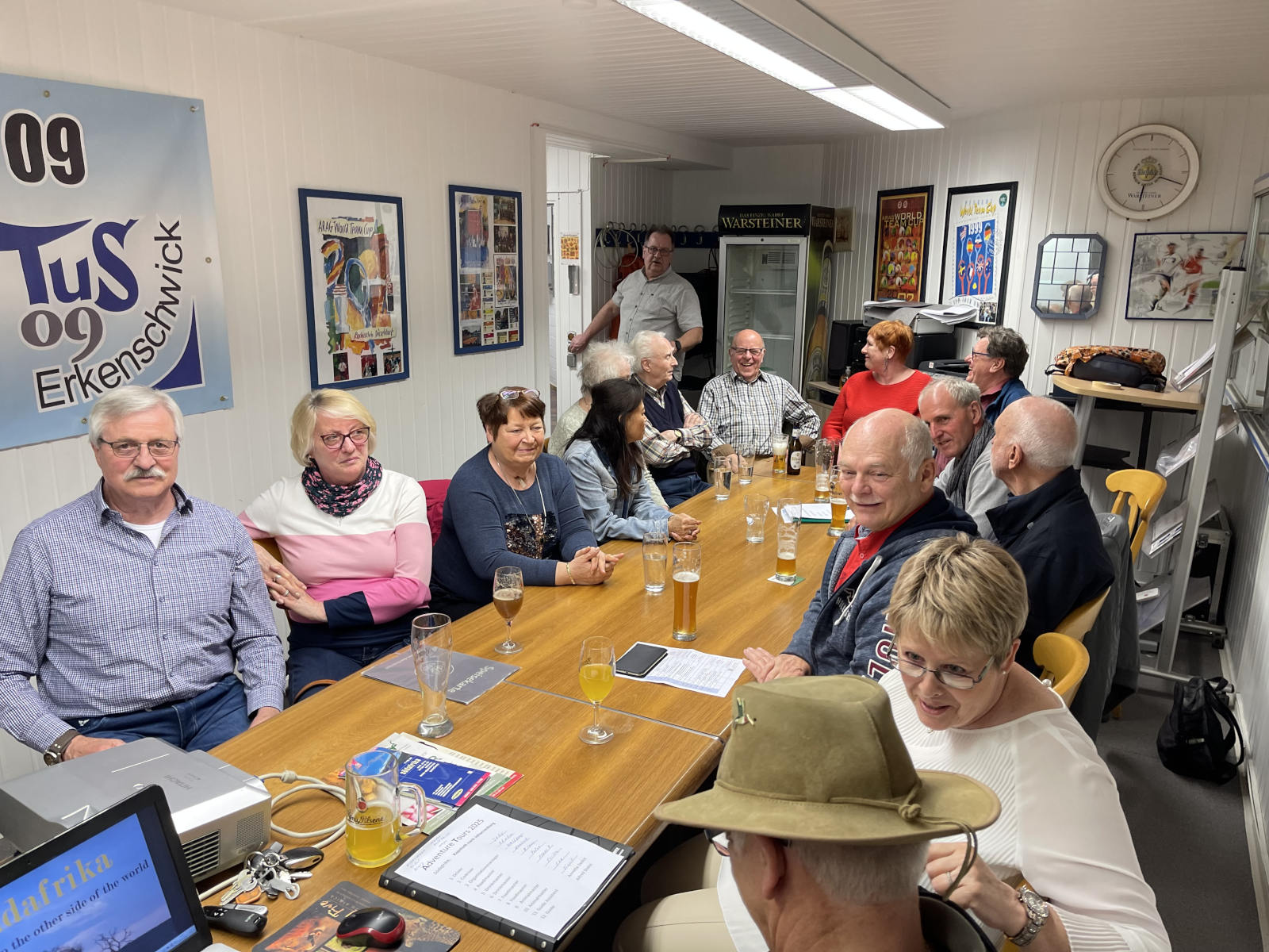 Am Dienstag, dem 09. April 2024 trafen sich 20 Teilnehmer zu unserem 2. Stammtisch in diesem Jahr. Diesmal hatten wir als Veranstaltungsort das Sitzungszimmer im Keller des TuS-Gebäudes gewählt. So konnten wir einfach das Licht ausschalten und unserem Referenten Alfred Dodot zuhören und seine Bilder auf der Leinwand sehr gut sehen. Im letzten Jahr hatte Alfred Dodot ebenfalls einen sehr interessanten Vortrag über die Bauernschaft Elpe gehalten, damals waren wir aber in der neu erbauten Blockhütte und dort hatte uns die Sonne den Blick auf die Leinwand fast unmöglich gemacht. Nach der Aufnahme der Essensbestellungen und einer kurzen Ansprache von unserem 1. Vorsitzenden Hans Günter Hennemann startete dann Alfred Dodot im Silberücken-Sweatshirt und mit Rangerhut seinen Vortrag. Durch die Einladung zur Hochzeit seines Freundes nach Südafrika wurde seine Leidenschaft für dieses Land geweckt. Inzwischen organisierte er schon des Öfteren mit seiner Frau Annette zusammen eine Safaritour im Kleinbus für 6 Personen. Auf eine solche Reise nahm er uns an diesem Abend mit, wobei er auch andeutete, das er sich die nächste RDB -Tour durchaus mit 12 Teilnehmern, also zwei Kleinbussen, vorstellen könnte. Mal sehen, ob sich Interessenten finden. Beginnend am Flughafen in Kapstadt, wo er schon mit seiner Frau auf uns wartete, startete unsere Tour. Nach der Besichtigung des Tafelberges, dem Kap der Guten Hoffnung und einigen großen Weingütern ging es dann die Küste entlang Richtung Indischer Ozean. Neben einer Walbootsfahrt und den Besuch eines Elefanten Nationalparks standen ca. 1500 km Richtung Swasiland in mehreren Tourabschnitten auf unserem Tourplan. Nach mehreren Tagen im Krüger Nationalpark, natürlich verbunden mit den Big 5, dazu gehören der Löwe, der Elefant, das Nashorn, der Büffel und der Leopard, näherte sich unsere Reise langsam dem Ende. Über Pretoria ging es dann zurück in die Heimat. Ein sehr interessanter Vortrag. Danke Alfred und Annette! Nach dem Vortrag gingen wir dann eine Etage höher ins Restaurant, wo quasi unser Essen schon auf uns wartete. Wieder einmal in sehr gemütlicher Atmosphäre gab es ein sehr leckeres Essen. Für die Getränke bedanken wir uns wieder einmal bei unserem Schatzmeister Falk Kwaß. |